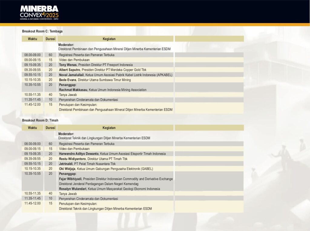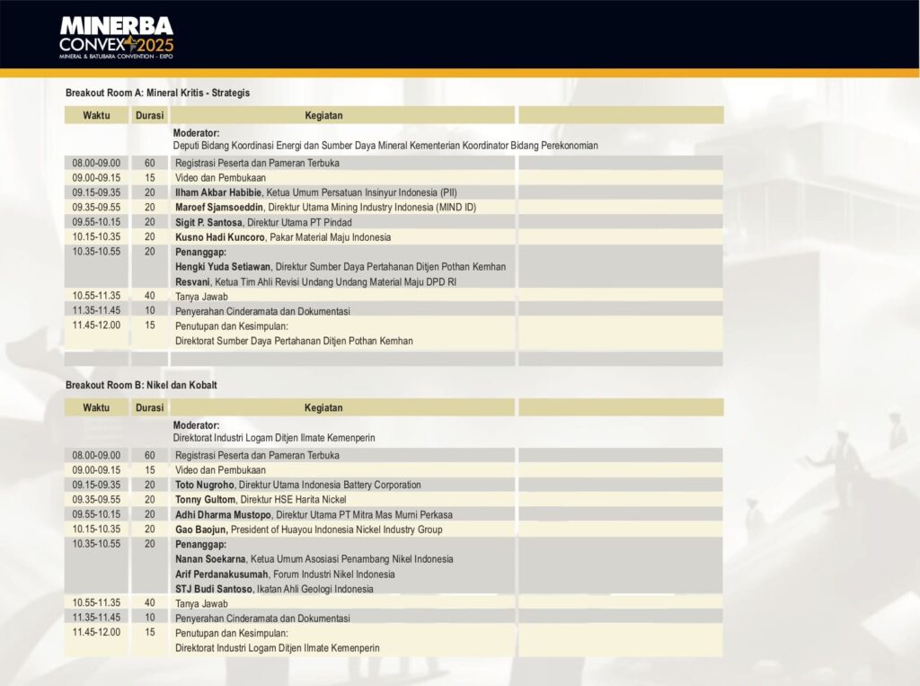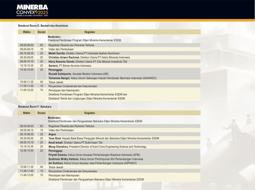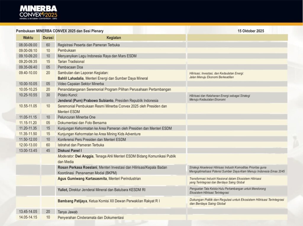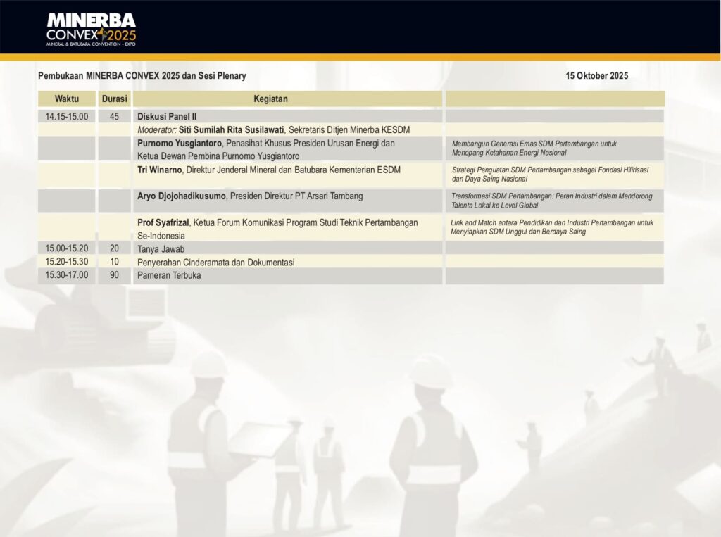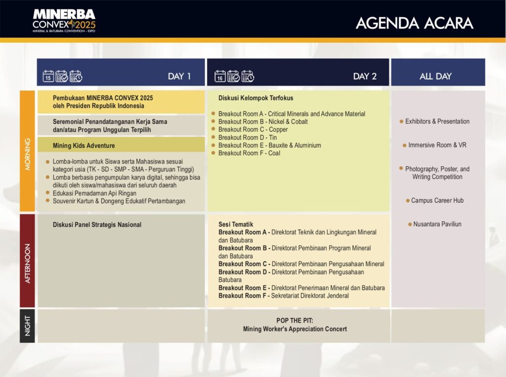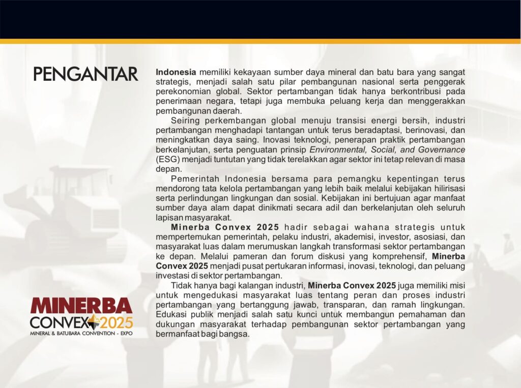 Tidak hanya bagi kalangan industri, juga memiliki misi Minerba Convex 2025 untuk mengedukasi masyarakat luas tentang peran dan proses industry pertambangan yang bertanggung jawab, transparan, dan ramah lingkungan. Edukasi publik menjadi salah satu kunci untuk membangun pemahaman dan dukungan masyarakat terhadap pembangunan sektor pertambangan yang bermanfaat bagi bangsa.